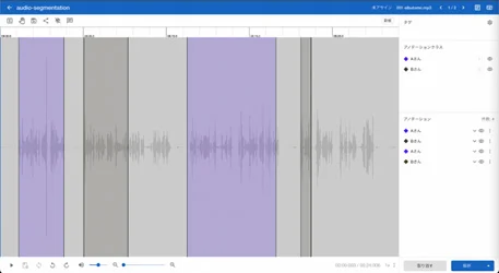 音声領域を分割して、その単位をアノテーション。書き起こしや、話者分類が可能。