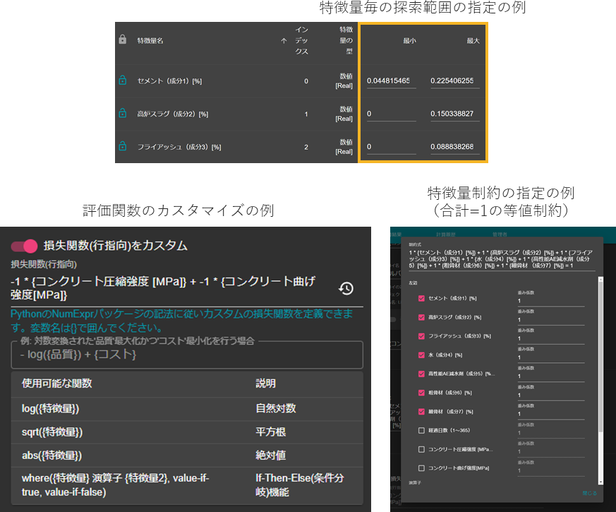 特徴量毎の探索範囲の指定や、特徴量の合計に対する制約の指定ができます。またカスタムの評価関数を用いることで、より詳細に制約を定義することも可能です。