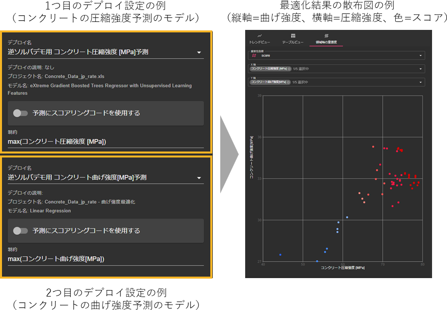 InverSolはDataRobotとシームレスに連携でき、DataRobotでデプロイしたモデルと連携することで、予測モデルベースの多目的最適化を実現できます。