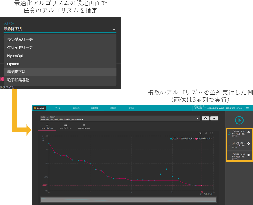 様々なアルゴリズムの中から任意のアルゴリズムを選択し、最適化を実行します。複数のアルゴリズムを並列に実行させることも可能です。