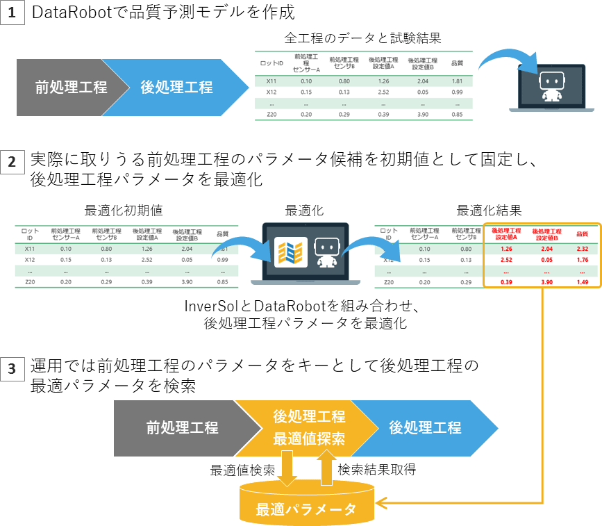 実際の生産現場において生産品質の向上は重要な課題であり、数%の不良品率の低減が大きなビジネスインパクトをもたらすこともあります。InverSolを利用し事前に最適な製造条件を求めておくことで、品質改善を行うことが可能です。以下の例では、後処理工程のパラメータの最適化にInverSolを利用します。