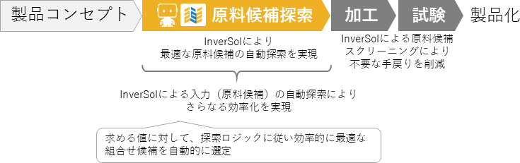 InverSolを活用し、自動で最適な入力条件を探索することで、これまで作業者の経験と勘に基づき判断していた配合設計・製品設計を自動化し、上市までのリードタイムを大幅に短縮することが期待できます。