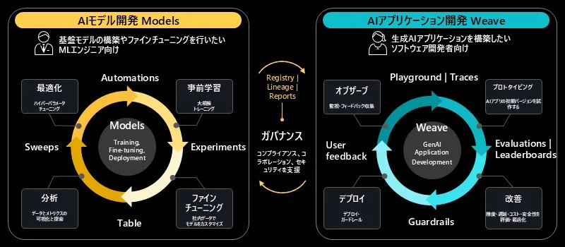 下図のようにW&B ModelsでAIモデルの構築・最適化を支援し、W&B Weaveで生成AIアプリの開発・評価・改善を支援。両製品でAI開発を包括的にサポートします。