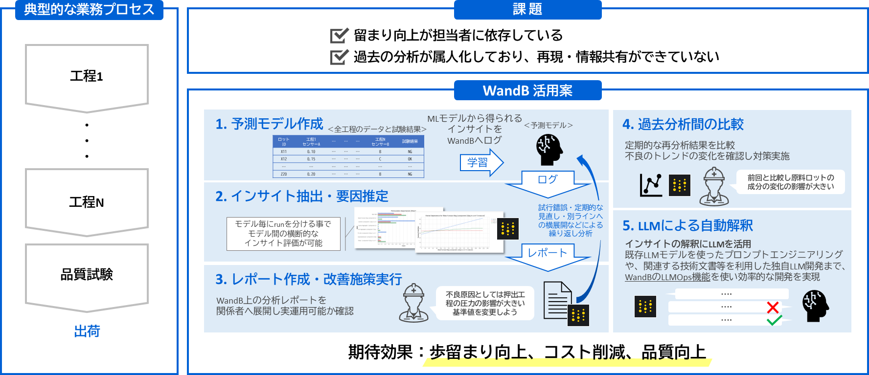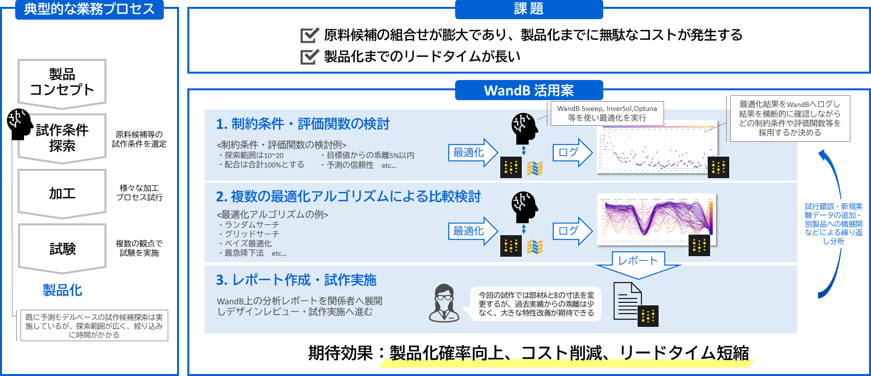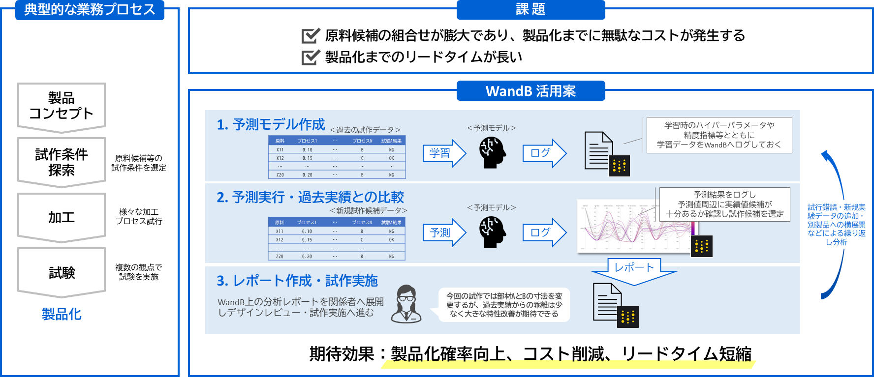 学習時のハイパーパラメータや精度指標、学習データをWandBへログ。予測結果から実績値候補が十分あるか確認し、試作候補を選定します。WandB上の分析レポートを関係者へ共有、デザインレビュー・試作実施へと素早く展開します。
