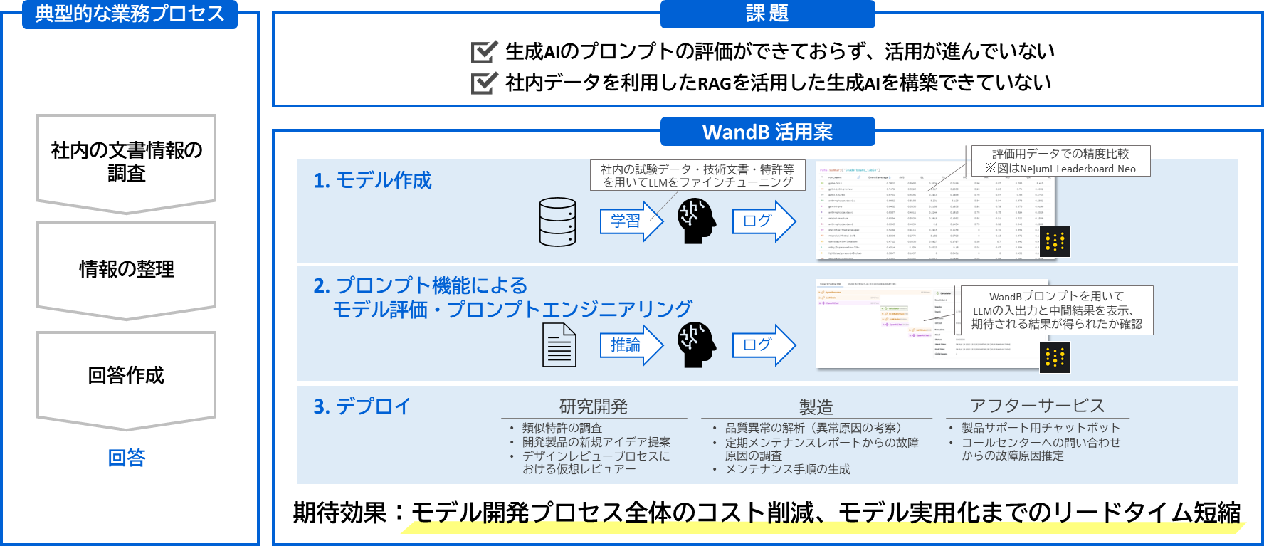 社内の試験データ・技術文書・特許等を用いてLLMをファインチューニング。評価用データで精度を比較し、WandBプロンプトを用いてLLMの入出力と中間結果を表示、期待される結果が得られたかを確認します。