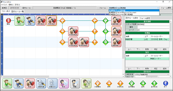 承認フローの定義もビジュアルに作成可能です。アイコンをマウスで配置し、プロパティの設定をするだけで申請金額や申請内容による条件分岐や各部署に同時並行で確認を進めるような複雑なワークフローを構築することが可能です。