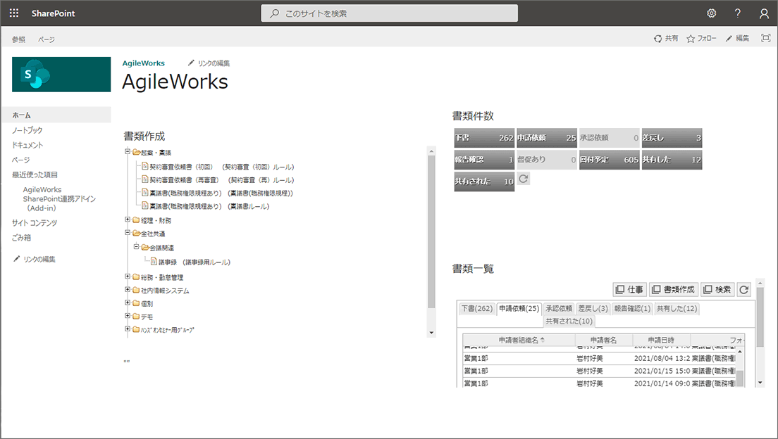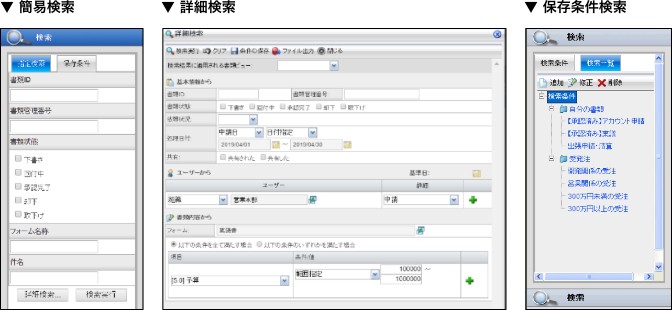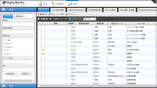承認完了した書類や申請途中の書類を検索する機能が充実しております。