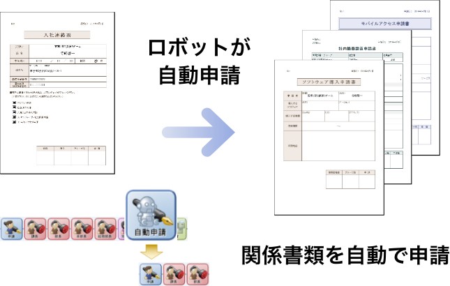 例:入社連絡票の内容を基にモバイルアクセス申請書やソフトウェア導入申請書を各担当者に自動で回付します。