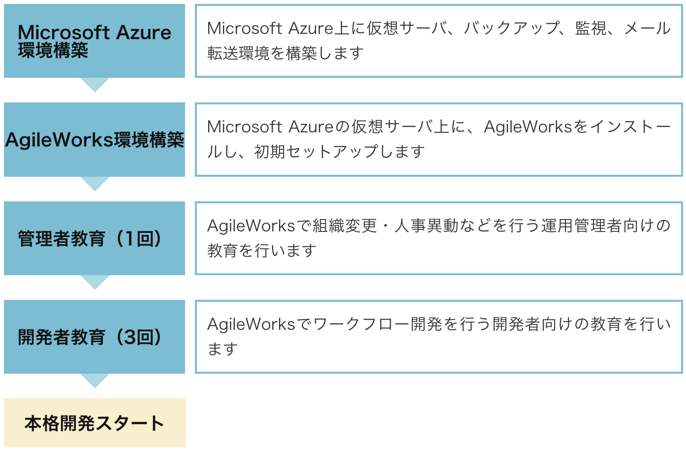 ご契約後の流れは以下の通りです。環境構築、管理者教育、開発者教育の期間は約1か月です。